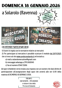 Proloco Solarolo News ed Eventi: MERCATINO DEL RIUSO, HOBBISTI E CREATIVI 2026 (no title) SAGRA DELLA POLENTA, BISÒ E SABADÒ MERCATINO DEL RIUSO, HOBBISITI E CREATIVI 2025 ACCENDIAMO LE LUCI DELL’ALBERO DI NATALE (30 novembre 2024) OKTOBERFEST SOLAROLESE 2024 FESTA DELL’ASCENSIONE 2024 SAGRA DELLA POLENTA, BISÒ E SABADÒ 2024